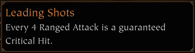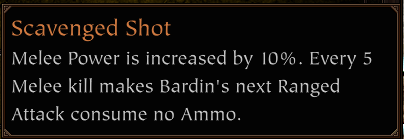 Removes the random crit on range weapon, no longer affected by Crit Chance, and making it a guaranteed crit every 4 shots(25% Crit Take a chance). Besides works on Career Skill – Crank Gun. Information technology can be used to procHunter trait consistently, or generate ammo withScrounger, or just increase your range weapon & Crank Gun damage by a bit since it'south a crit chance increment to your range arsenal.