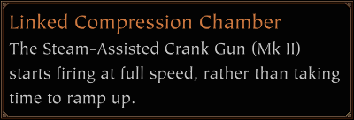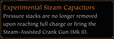 Holding reload with the Steam-Assisted Crank Gun (Mk II) equipped builds Pressure. Each stack of Pressure lasts for 12 seconds and gradually restores the Power Bar. Stacks upwardly to 5 times.
