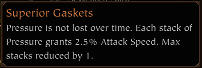 Superior Gaskets permit you put least amount of attention to the Pressure stacks since you need to apply Drakgun and take care of heat with this build most of time. The attack speed also counters the loftier heat slow down from Drakefire weapon when yous need to apply mlee.