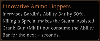 A longer Career Skill bar means y'all can utilise potions/Pressure level stacks more than. You can also kill the horde with ane shooting department without cranking easier. For Monster, if you have a safe position this version of Crank Gun can deal the highest harm. The complimentary shooting from killing a special is more often than not a pocket-sized bonus since information technology's inconsistent and only last few second, but on higher difficulty it could be game changing.